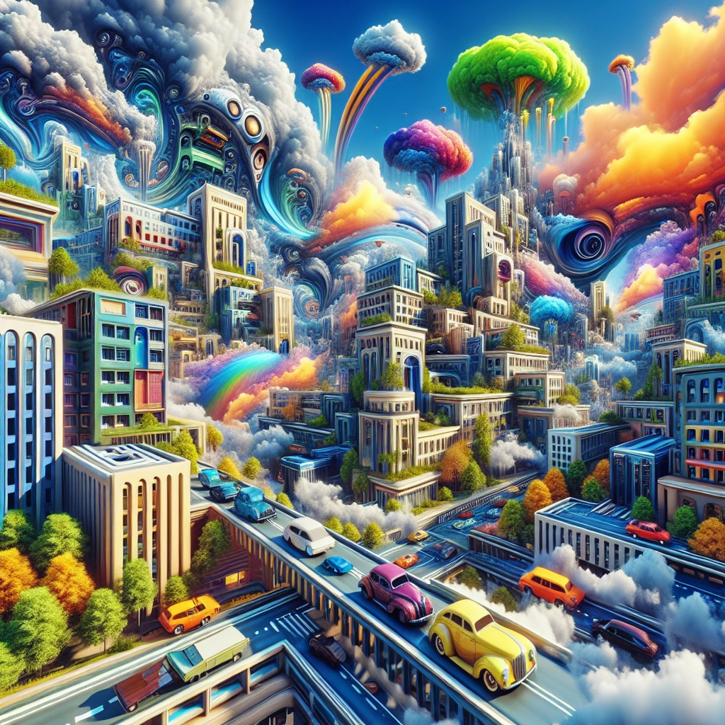 In this captivating cityscape, the boundaries of reality blur, inviting exploration of the intriguing interplay between urban design and the environment. Vivid hues breathe life into the surroundings, while unconventional pairings spark imagination, suggesting a realm where the extraordinary thrives. Suspended vehicles gliding through whimsical clouds imply a seamless coexistence, even in a domain that challenges conventional wisdom. This enchanting vista encourages viewers to reflect on their aspirations and the ever-changing nature of their own realities.