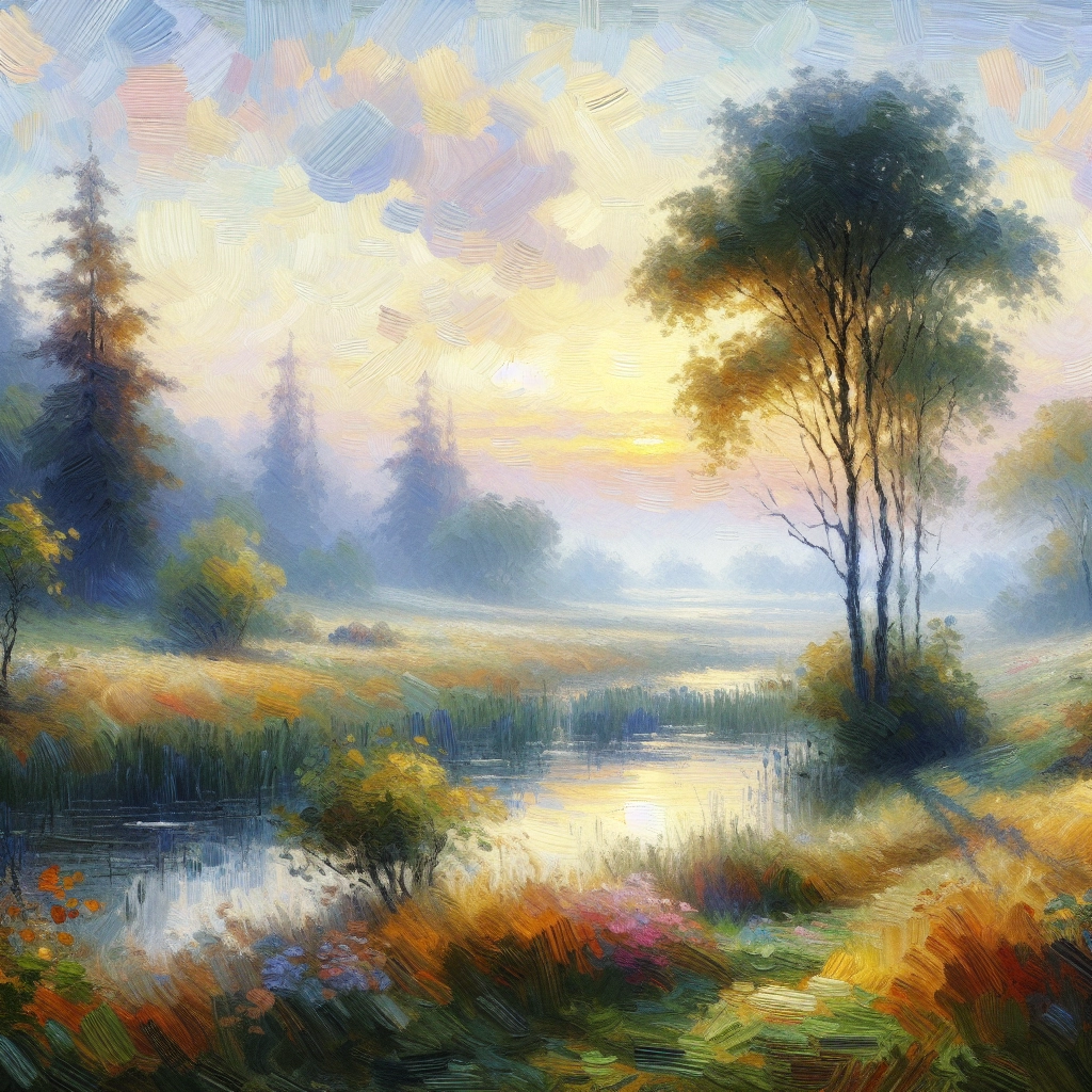 This scene radiates calmness and serenity, as if the world has paused to appreciate the dawn's gentle embrace. The soft hues and warm light draw you into this perfect moment, where nature stirs softly around you. The delicate sounds and harmonious visuals foster a deep sense of reflection and peacefulness, inviting the viewer to immerse themselves in the tranquil beauty of a new beginning. It’s a celebration of the quiet charm that the morning brings, offering solace and inspiration for the day ahead.