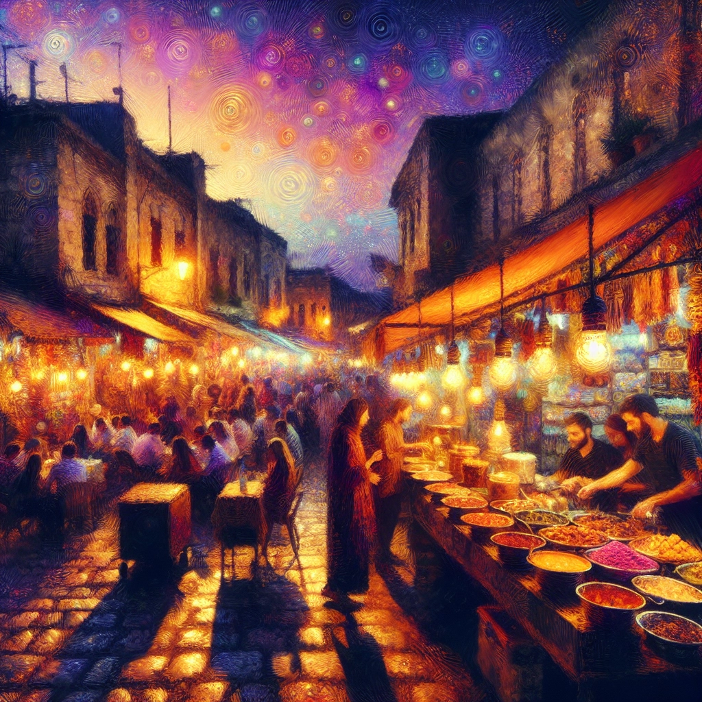 Immerse yourself in this vibrant impression of a bustling night market, alive with energy and color. The air is filled with enticing aromas of spices and grilled delights, wrapping around you like a warm hug. Lanterns flicker softly, illuminating the cheerful stalls with a golden glow. As laughter and chatter blend into the night, the atmosphere is electric with a spirit of connection and discovery, where every passerby is part of an unfolding tale of culinary delight. Brilliant hues of red and indigo paint a picture rich with warmth and nostalgia, inviting you to savor the moment and embrace the unforgettable flavors and camaraderie.