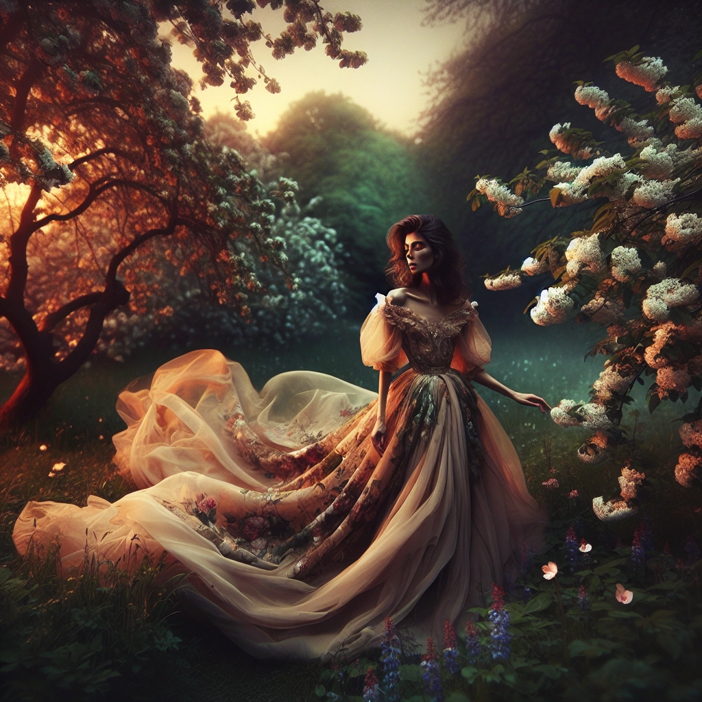 In this mesmerizing tableau, the fusion of the natural world and chic couture unfolds an enchanting story of grace and peace. The soft pastels of dusk blend seamlessly with vibrant greens and gentle petals, stirring a sense of serene allure. The model, draped in a gown that cascades like a gentle stream, epitomizes elegance and composure, reminiscent of a whimsical fable. This scene inspires profound feelings of awe and calmness, beckoning the observer to immerse themselves in this harmonious interplay of fashion and nature’s beauty.
