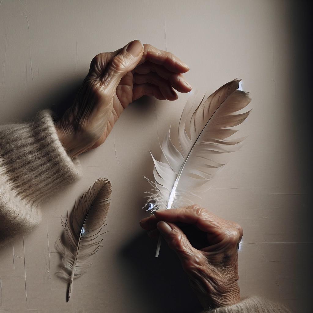 This minimalist artwork beautifully encapsulates the transient nature of existence by showcasing weathered hands holding a delicate flower, representing vulnerability and elegance. The surrounding vast negative space evokes sentiments of solitude and deep thought, prompting the viewer to ponder the narratives woven into those hands and the cherished moments they signify. Soft hues and gentle illumination establish a serene ambiance, while the selected objects serve as a touching reminder of the elegance found in life's understated wonders.