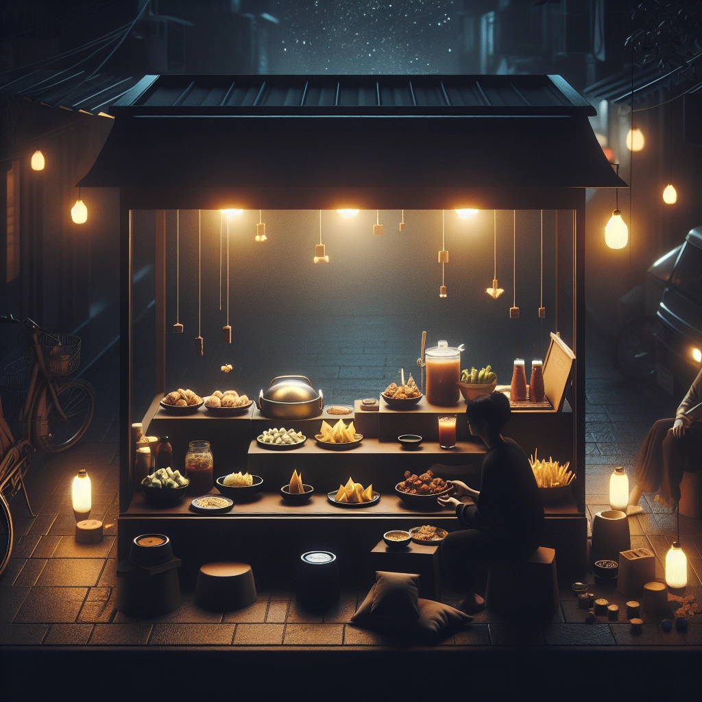 This image beautifully encapsulates the vibe of street cuisine through a sleek and minimalistic lens. Soft light illuminates a secluded spot in the bustling night, enhancing the allure of the culinary delights presented. The surrounding shadows amplify the enchantment of the scene, drawing attention to the artfully displayed meals. This simplistic yet captivating environment not only captivates the gaze but also invites a moment of reflection amid the urban hustle. It creates a perfect harmony of understated elegance and city allure, inspiring viewers to envision themselves indulging in these exquisite dishes under a canopy of stars.